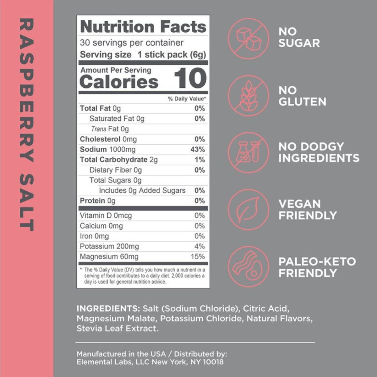 Raspberry Salt: Salt (Sodium Chloride), Citric Acid, Magnesium Malate, Potassium Chloride, Natural Flavors, Stevia Leaf Extract.
