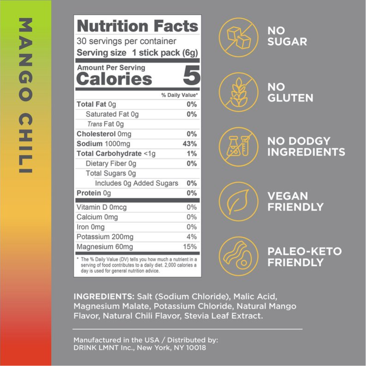 Mango Chili: Salt (Sodium Chloride), Malic Acid, Magnesium Malate, Potassium Chloride, Natural Mango Flavor, Natural Chili Flavor, Stevia Leaf Extract.