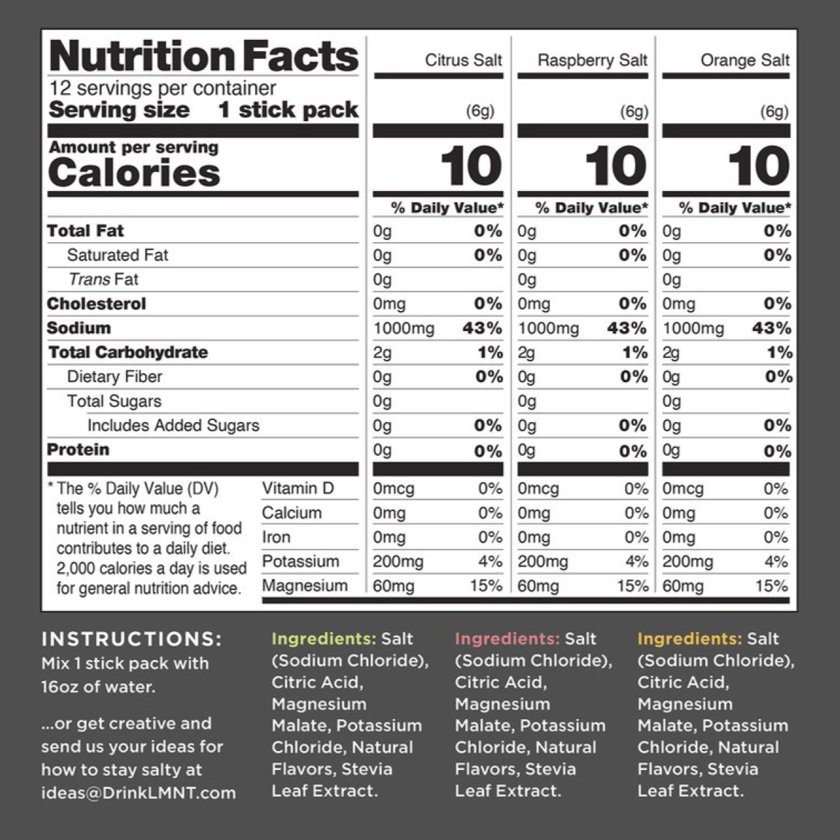 First, it’s important to note that LMNT is meant to supplement your electrolyte intake - it should not be your sole source of electrolytes in a day.
