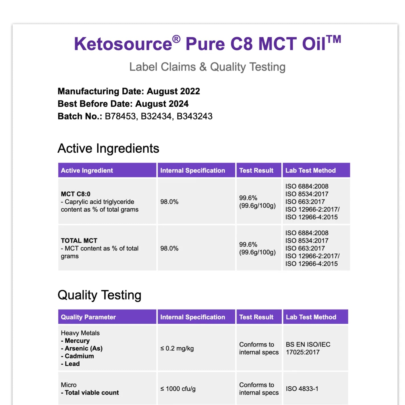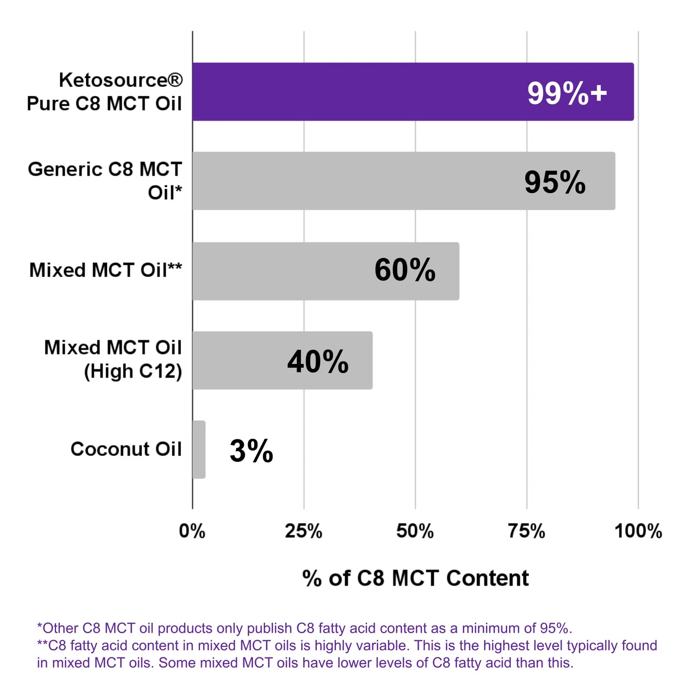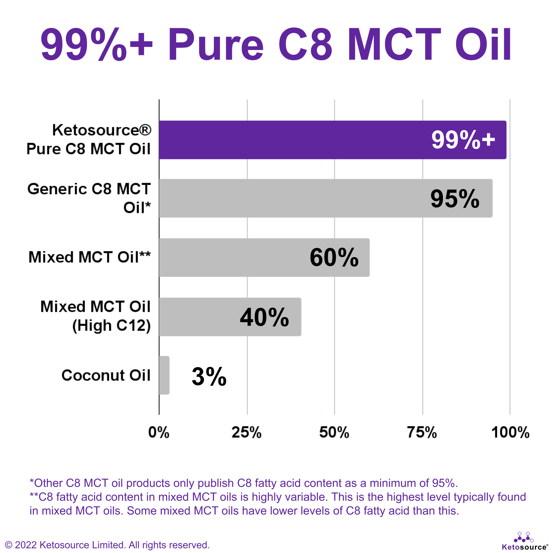 Ketosource Pure C8 MCT oil is a pure Caprylic Acid Triglycerides (also known as C8) product.See this in-depth article on Caprylic Acid (C8) to understand the research and how it works.
